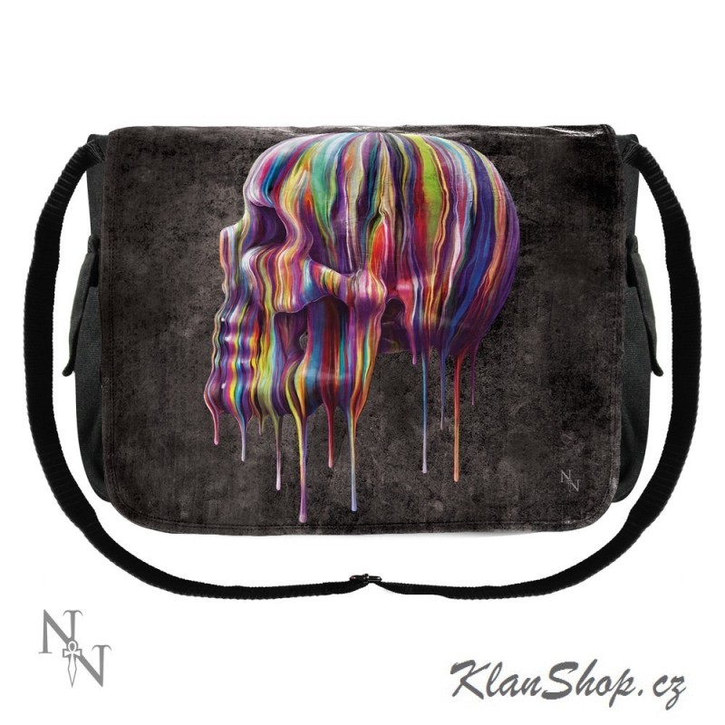 Messenger taška přes rameno se vzorem - roztékající se lebka - duhové barvy.