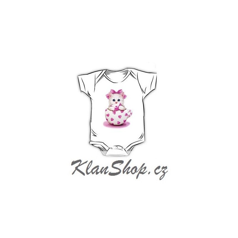 Dětské bílé (kojenecké) body (dupačky) s potiskem – Bílé koťátko sedící v hrníčku s růžovou mašlí a růžovými srdíčky.