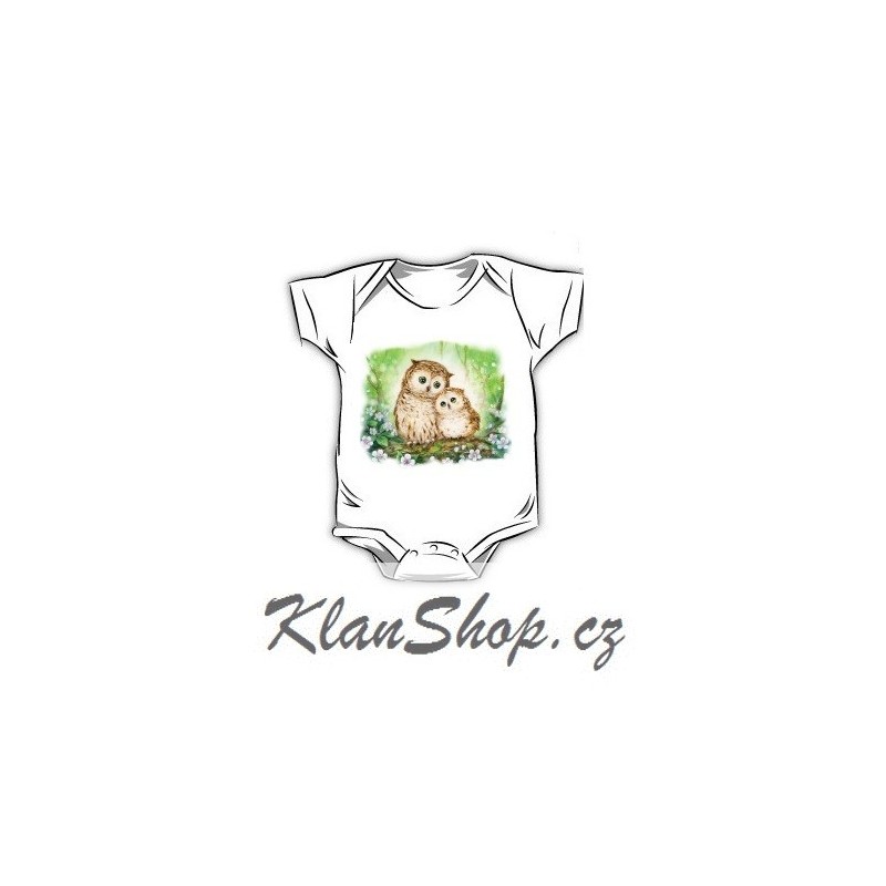 Dětské bílé (kojenecké) body (dupačky) s potiskem – dvě sedící sovičky v lese.