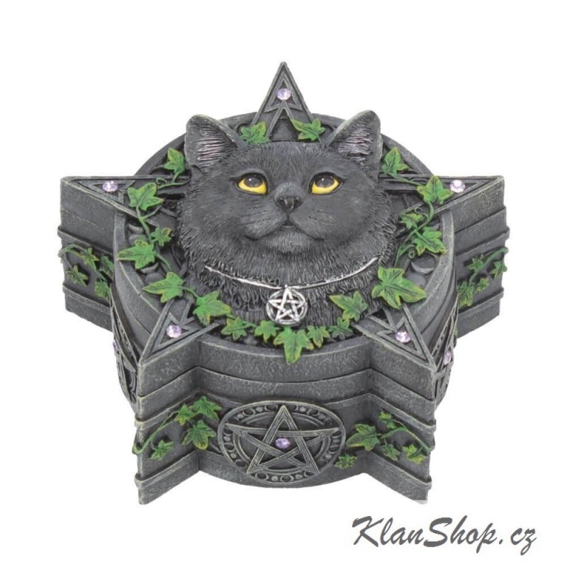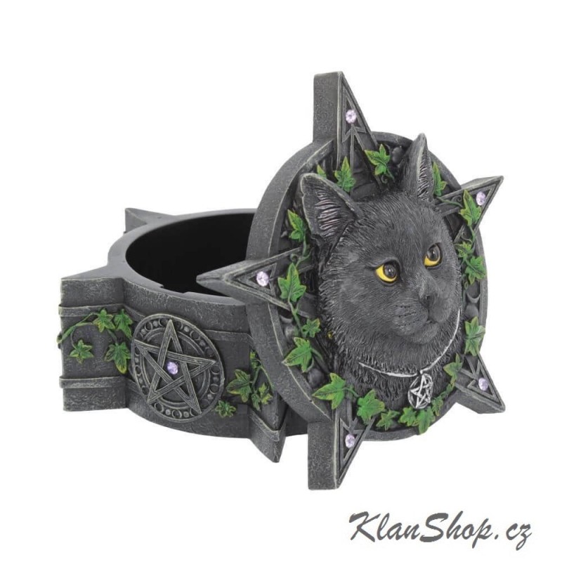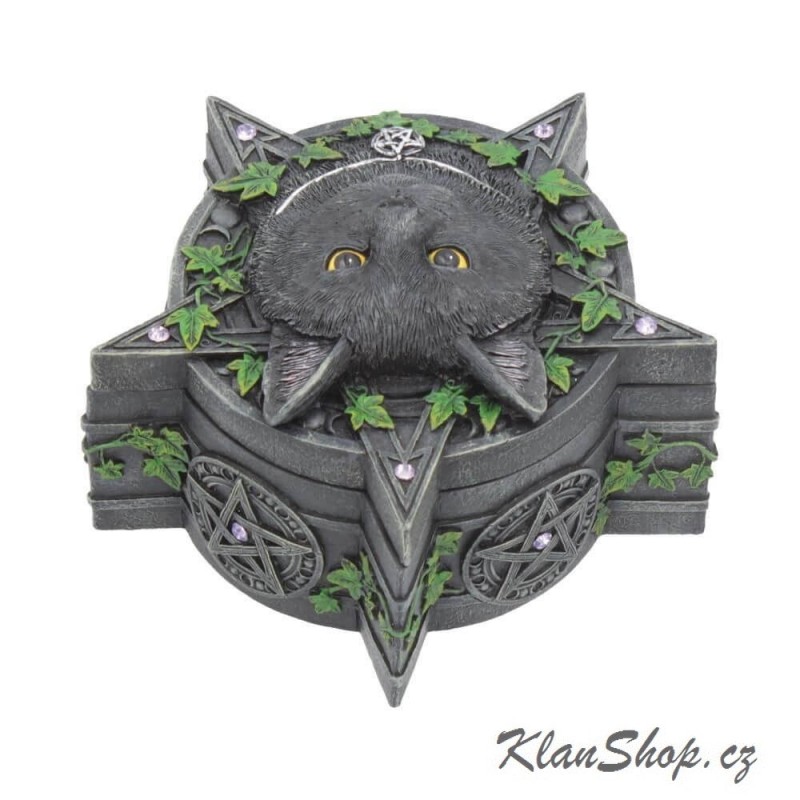 Dekorační krabička (úložný box či dóza) - černá kočka v pentagramu s břečťanem.