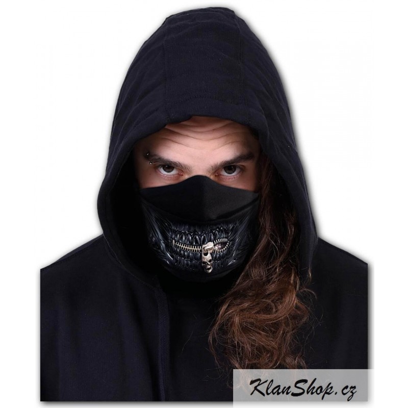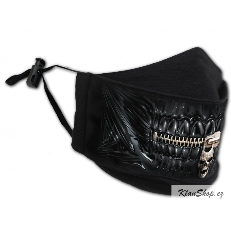 Ochranná maska s potiskem - vzhled černé lebky s pusou na zip s lebkou (zip je pouze potisk).