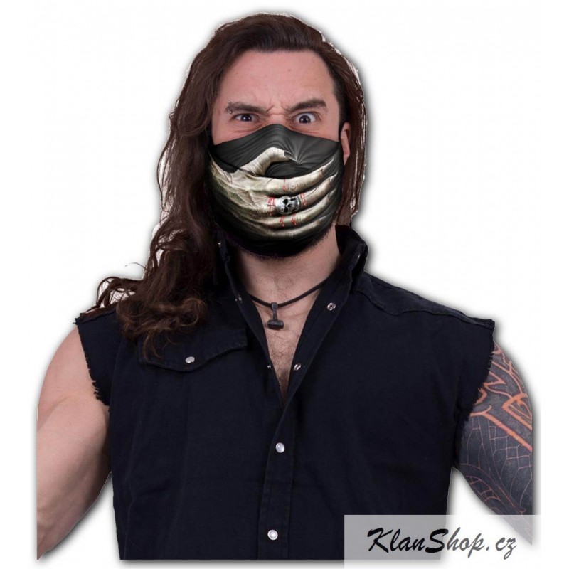 Ochranná maska s potiskem - ruka kostlivce (upíří ruka) zakrývající ústa.
