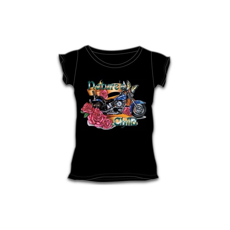 Dámské tričko s krátkým rukávem a potiskem, modrá motorka.