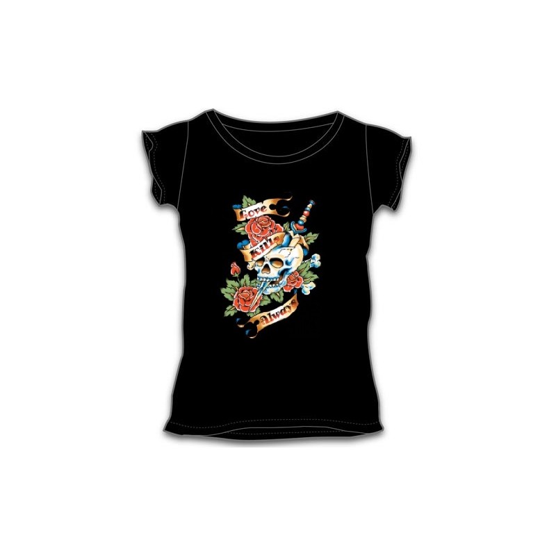 Dámské tričko s krátkým rukávem a potiskem, láska zabíjí, lebka s dýkou.