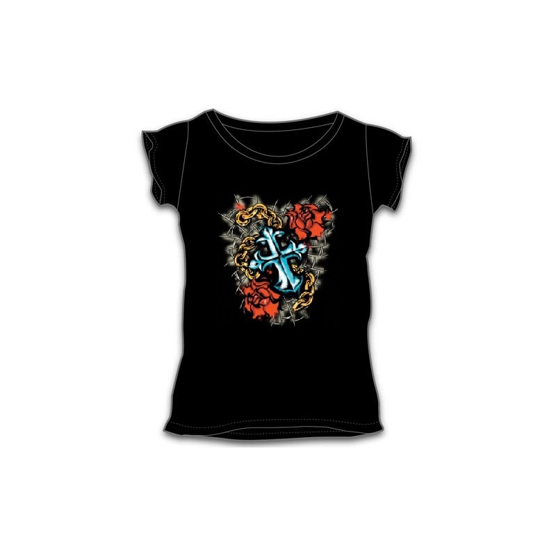 Dámské tričko s krátkým rukávem a potiskem, růženec s růžemi.