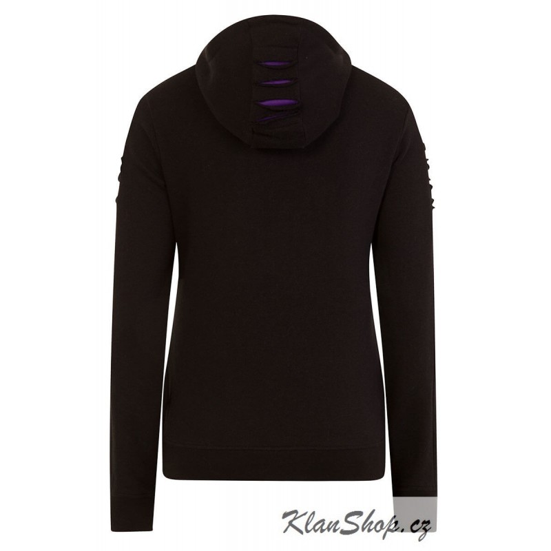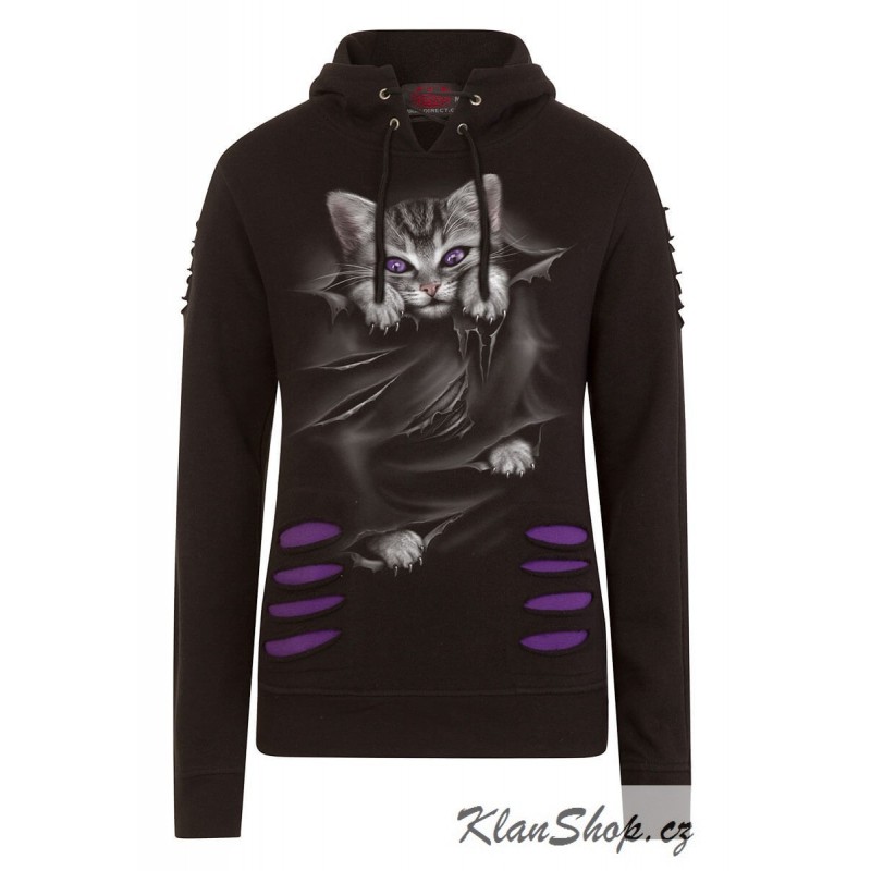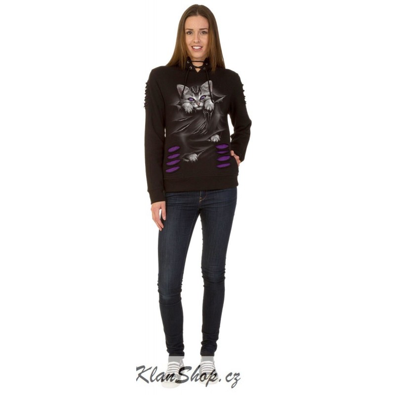 Dámská černá mikina s potiskem a kapucou bez zipu, fialovooká šedá kočka, fialové rozparky.