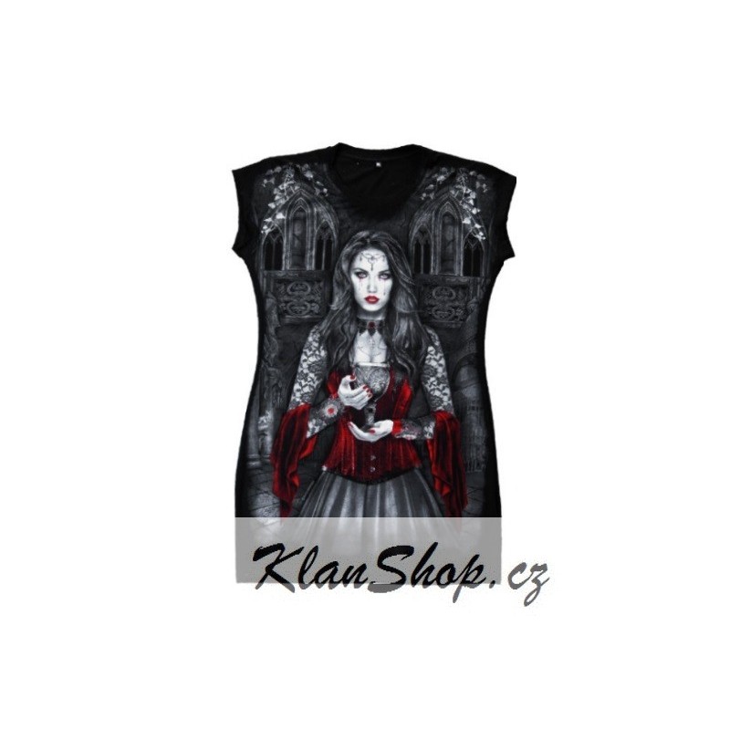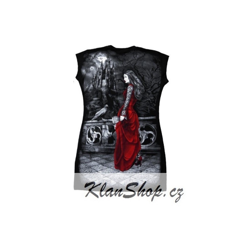 Dámské šaty s celoplošným potiskem (tunika) - Upírka s kalichem krve, gotický hrad s černou vránou.