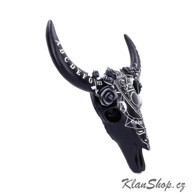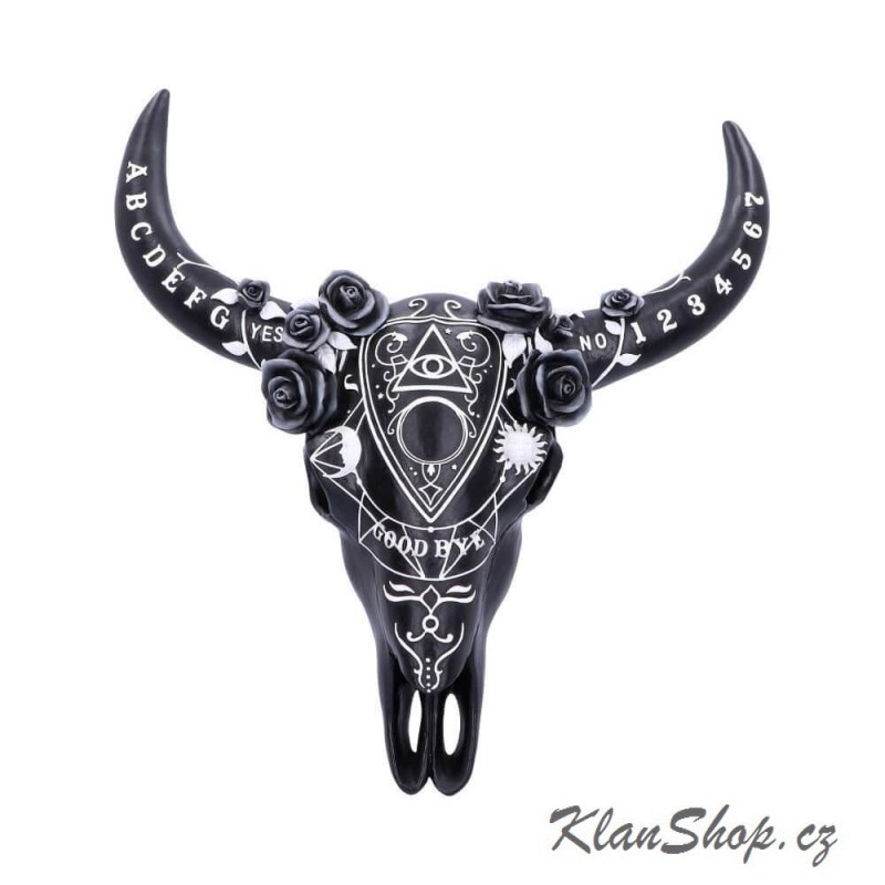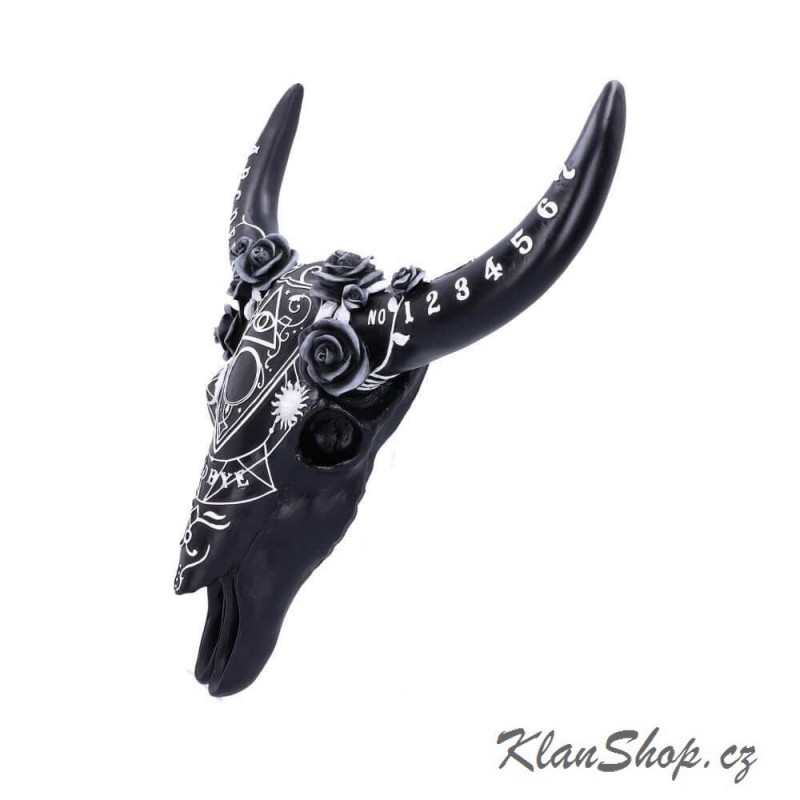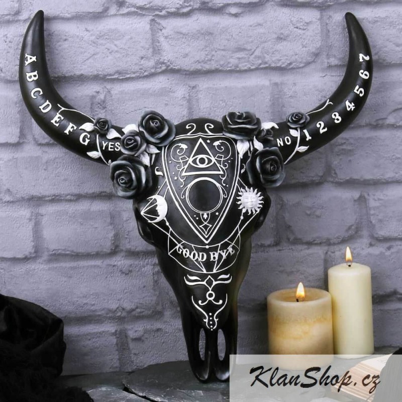 Nástěnná dekorace na zeď - zvířecí lebka s černými růžemi se spirituálními Ouija znaky.