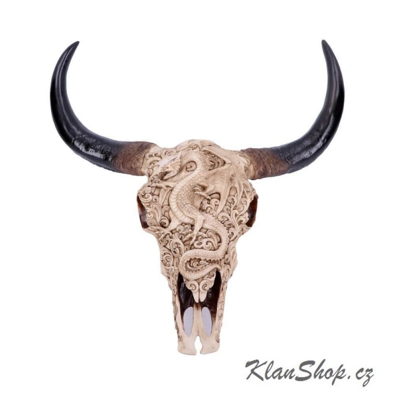 Nástěnná dekorace na zeď - zvířecí lebka s mýtickými ornamenty a draky.