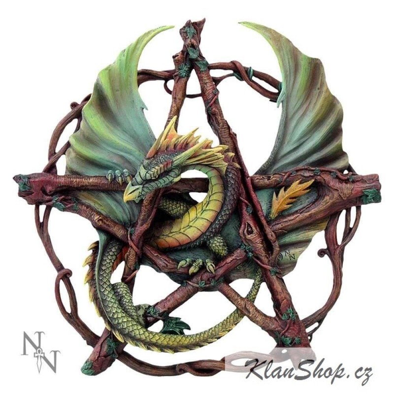 Nástěnná dekorace na zeď - pentagram složený z větví, zelený drak.