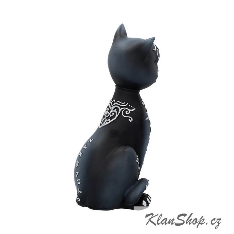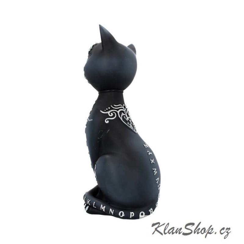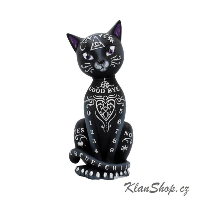 Dekorační soška (figurína) - černá fialovooká sedící kočka s Ouija písmeny a číslicemi.