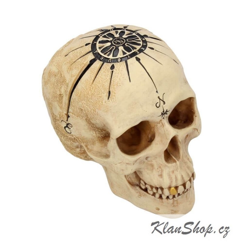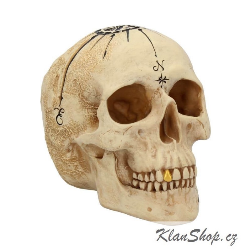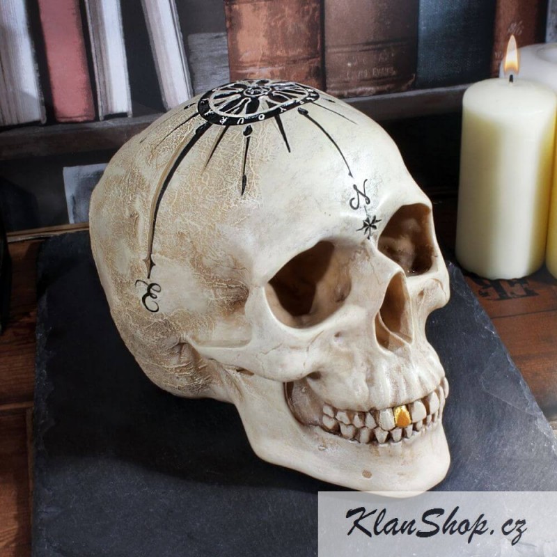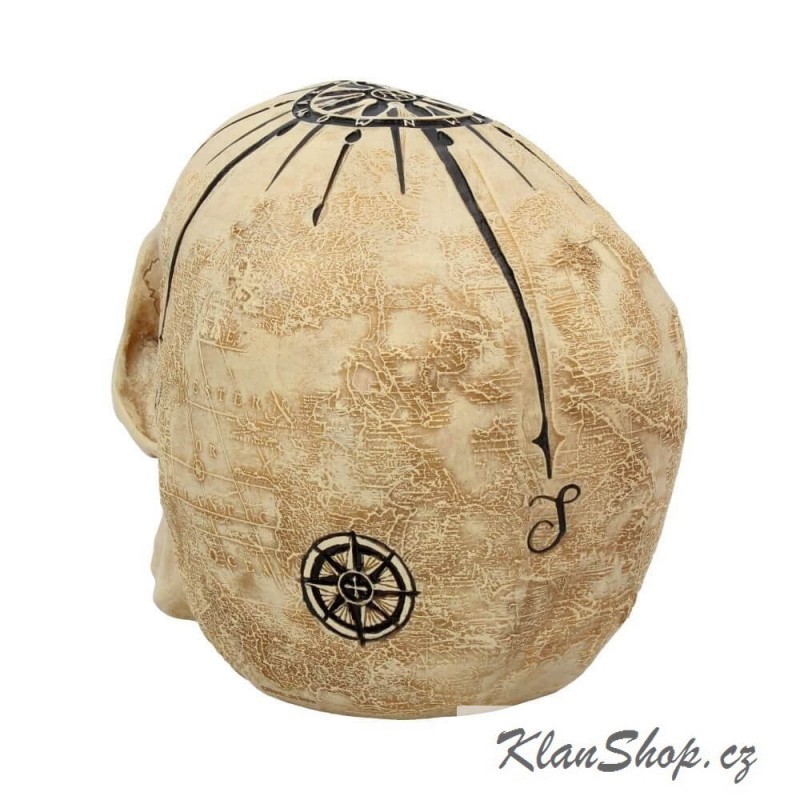 Dekorační soška (figurína) - lebka s kompasem a vyobrazenou námořnickou mapou světa.