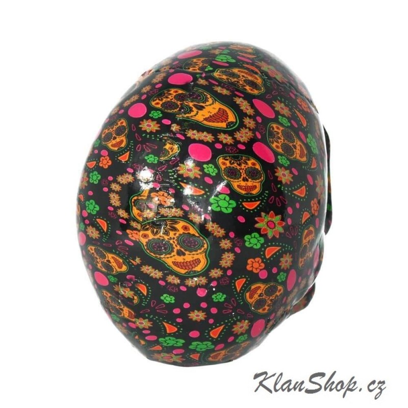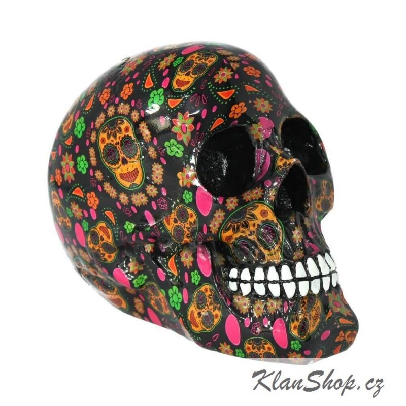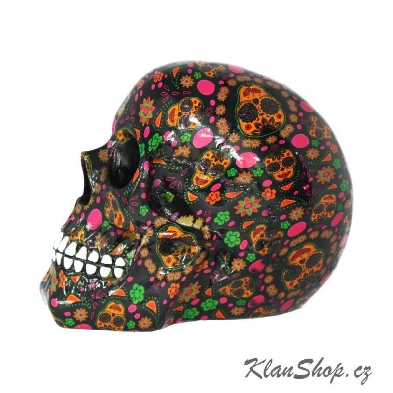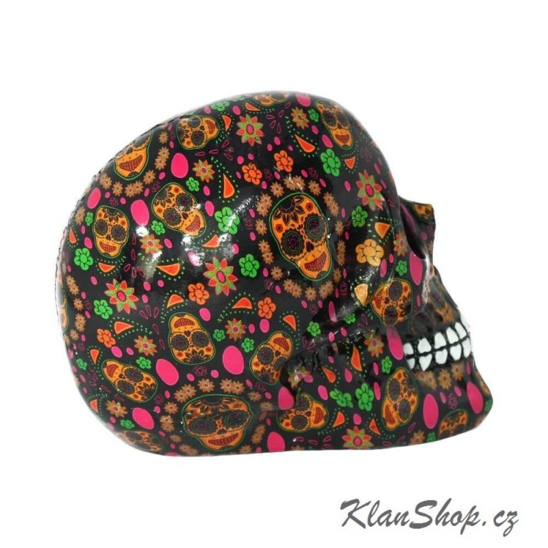 Dekorační soška (figurína) - lebka z pryskyřice polepená Dia de los muertos lebkami v tattoo stylu.