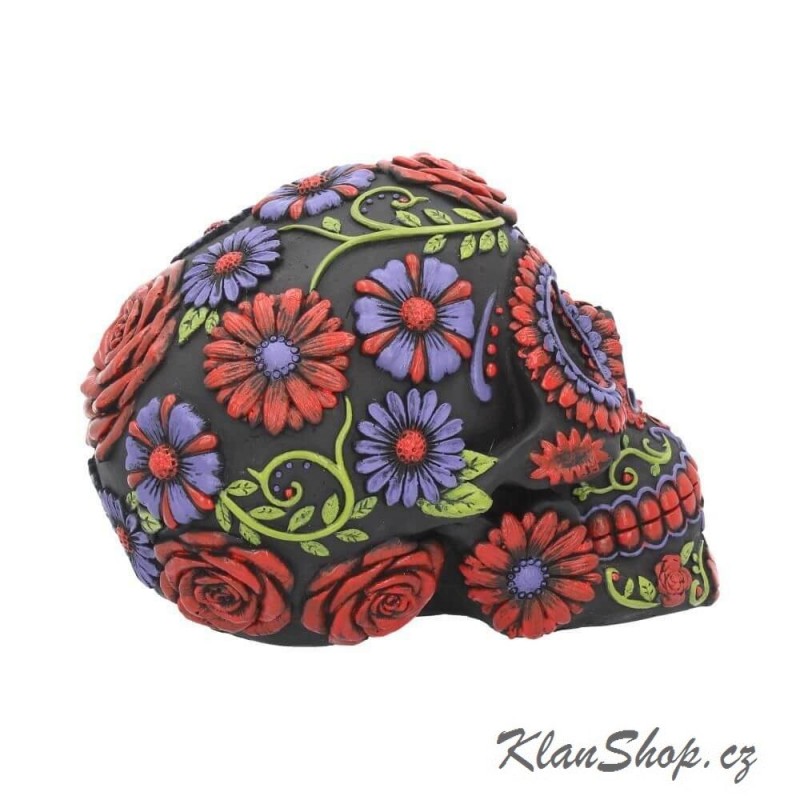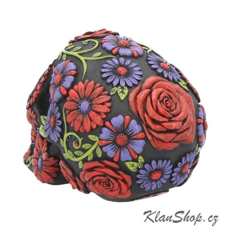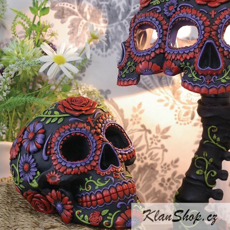 Dekorační soška (figurína) - lebka Dia de los muertos s růžemi a kopretinami.