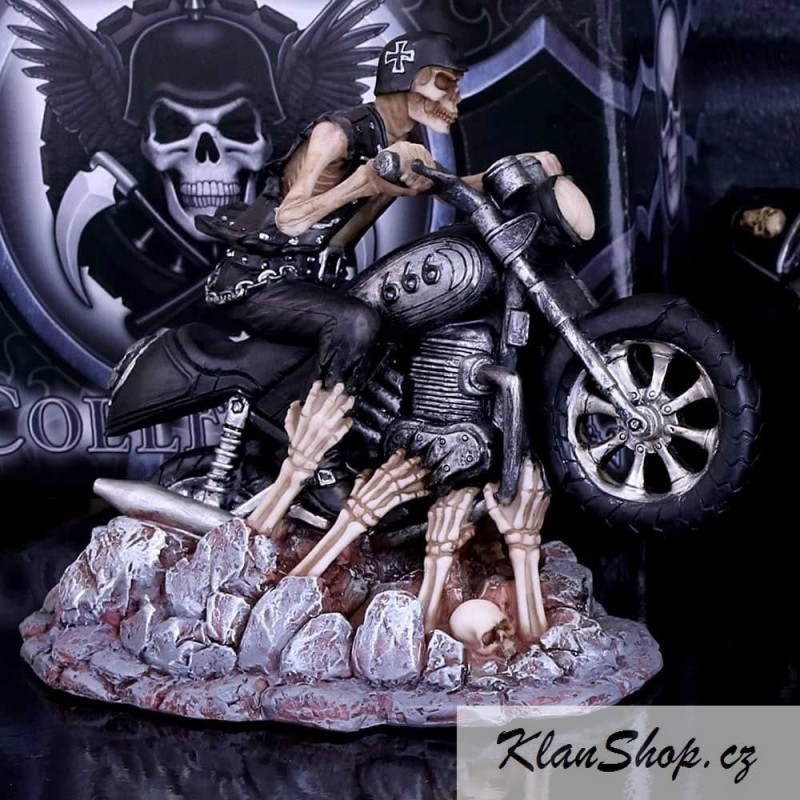Dekorační soška (figurína) - hell rider kostlivec s helmou café raceru, skeleton ruce z pekla 666.