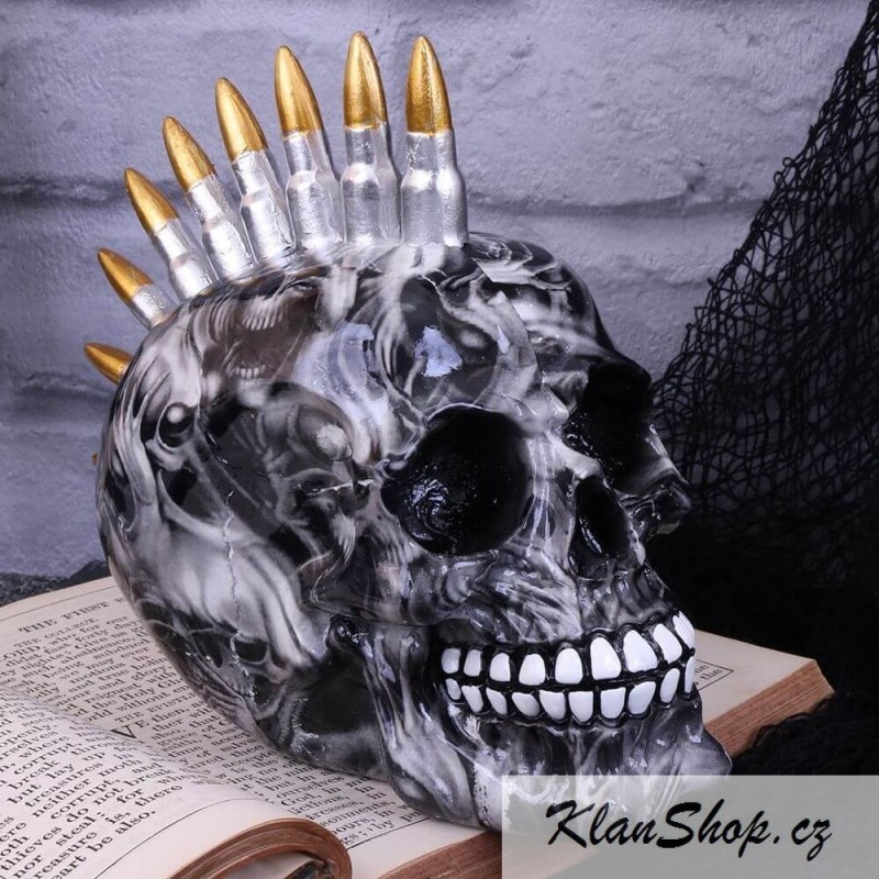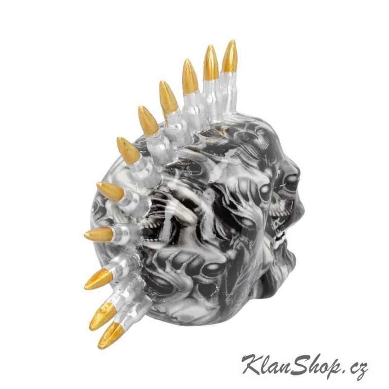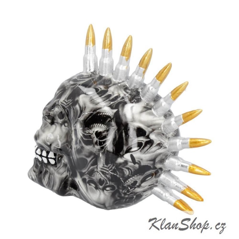 Dekorační soška (figurína) - lebka s potažená fólií tvořenou z lebek s kulkami.