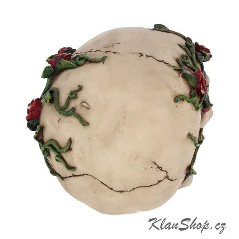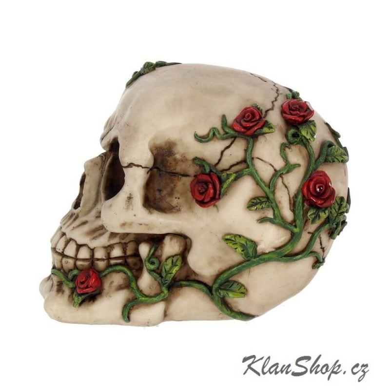 Dekorační soška (figurína) - lebka s rudými růžemi.
