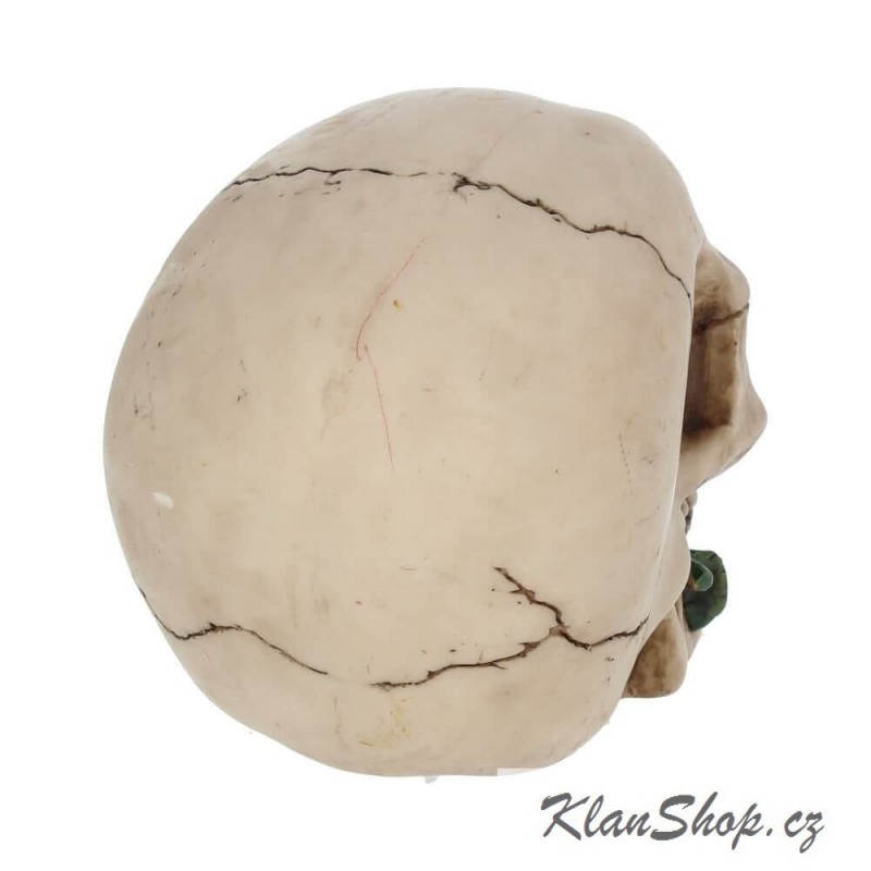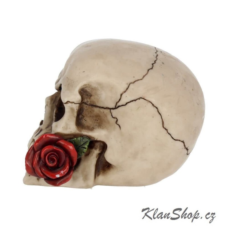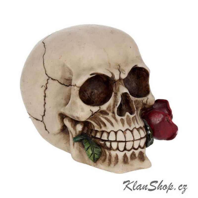 Dekorační soška (figurína) - lebka s červenou růží v puse.