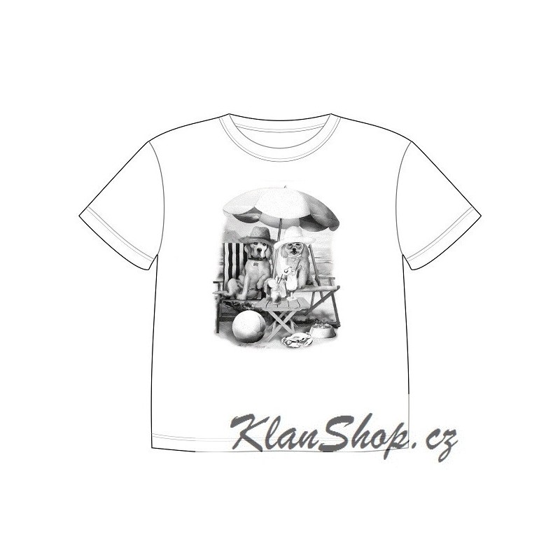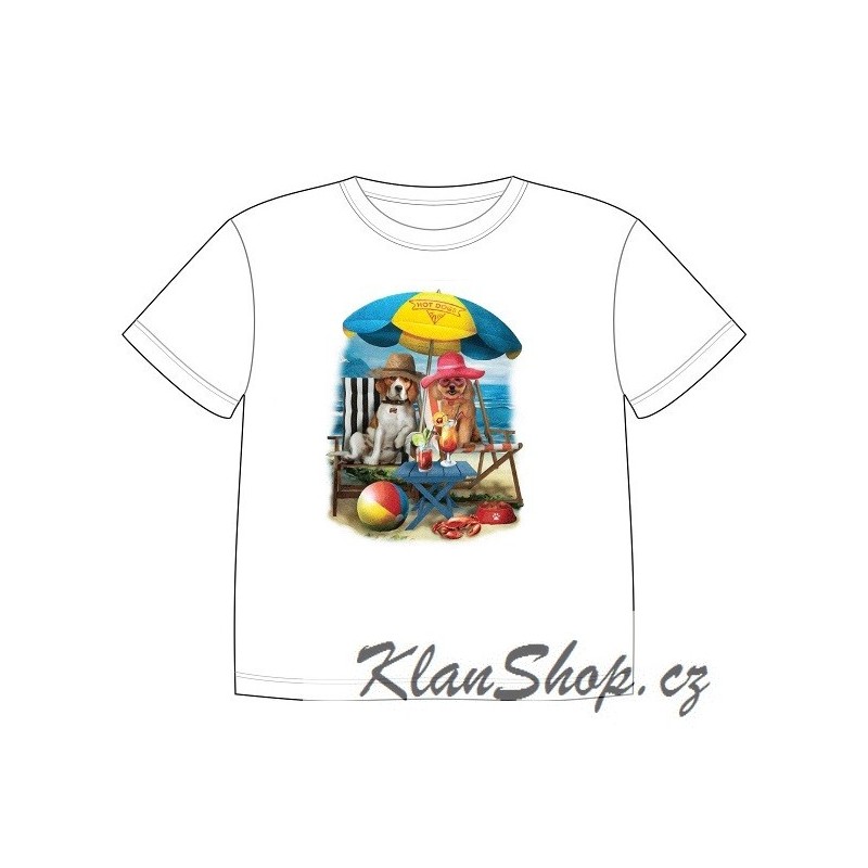Dětské tričko s dobravujícím se potiskem – Pejsci ležící na pláži.