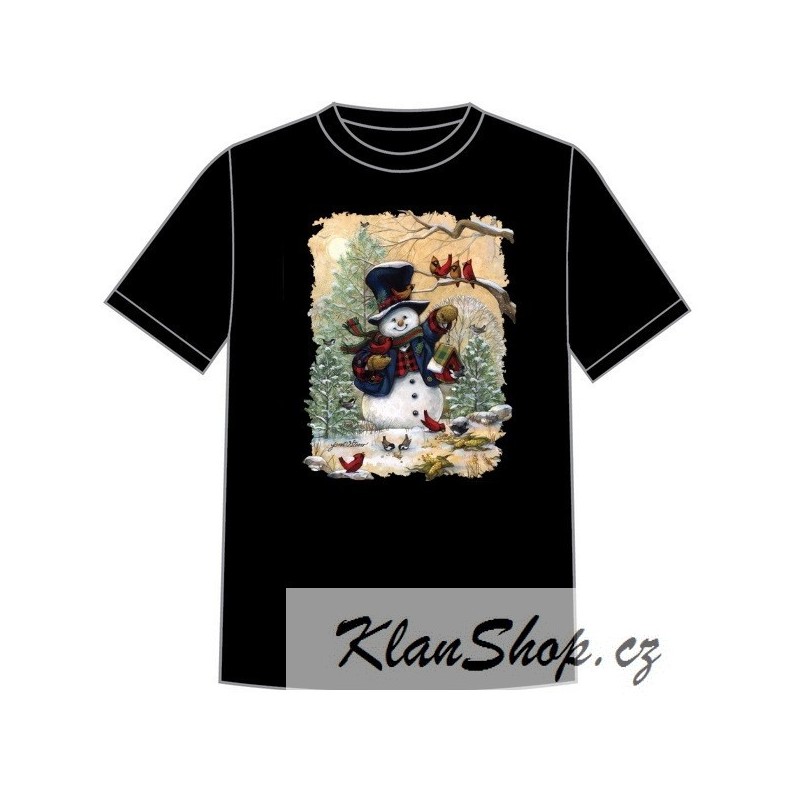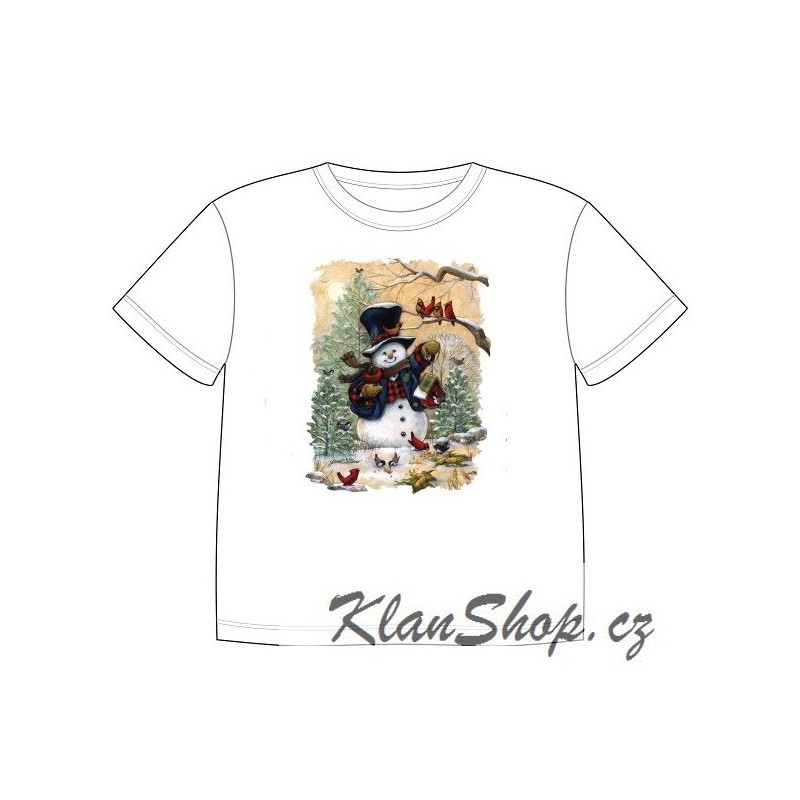 Dětské tričko s potiskem – Sněhulák krmící ptáčky.