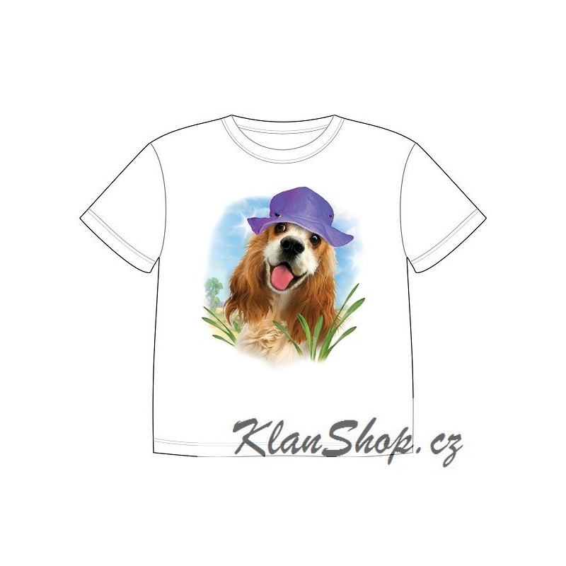 Dětské tričko s potiskem – Kokršpaněl s fialovým kloboukem.