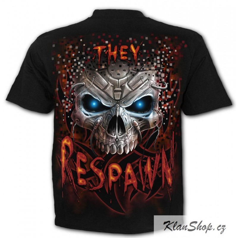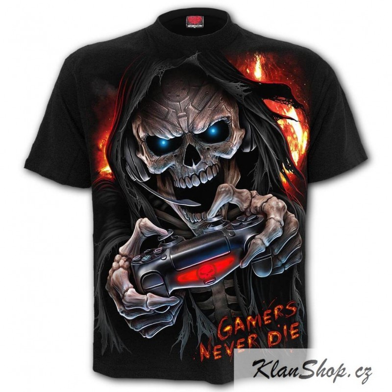 Dětské černé tričko s krátkým rukávem a potiskem, kostlivec hrající na Playstationu.