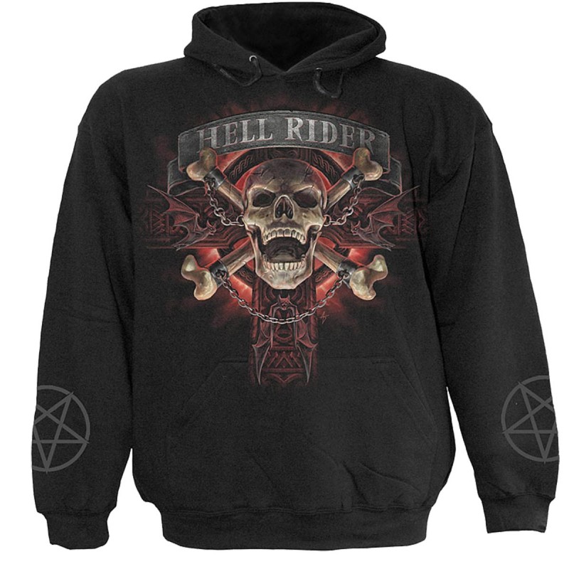 Dětská mikina s kapucou a potiskem, černá, kostlivec na hořící motorce.