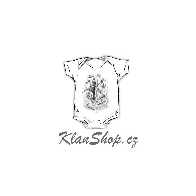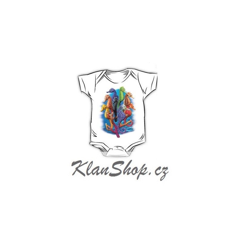 Dětské bílé (kojenecké) body (dupačky) s dobarvujícím se potiskem – Barevní mořstí koníci.
