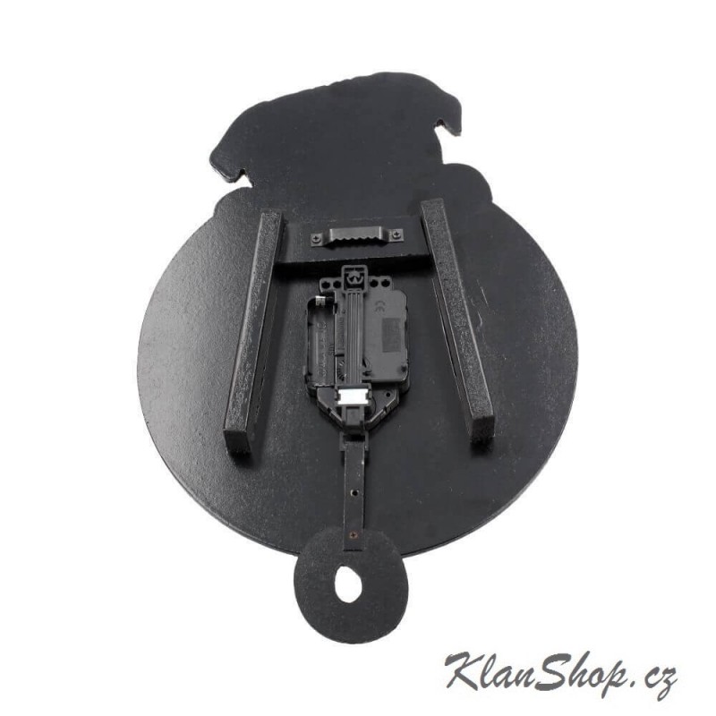 Dekorační hodiny s obrázkem - mops držící hodiny.