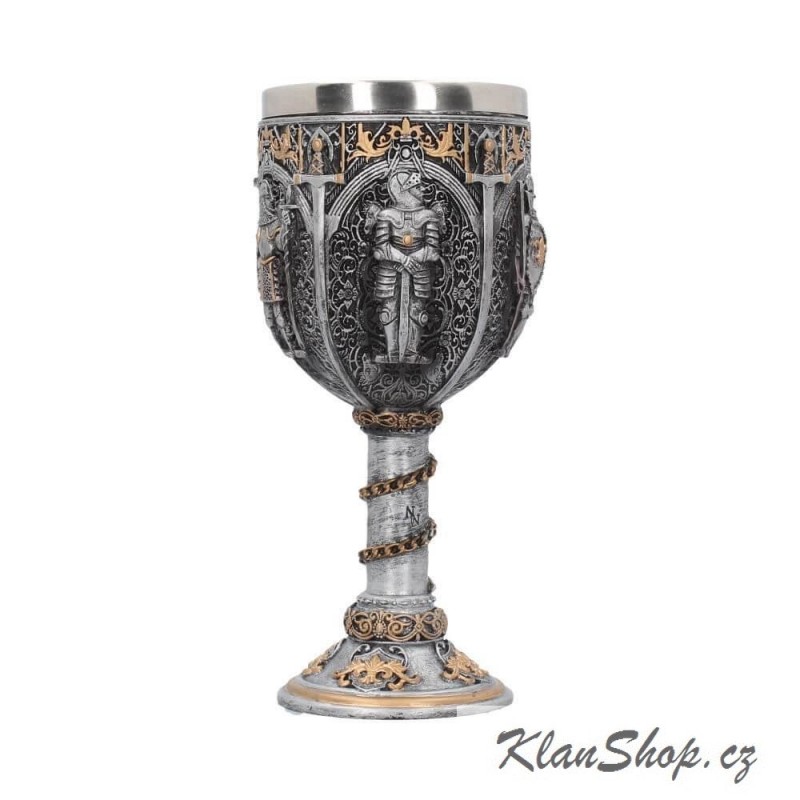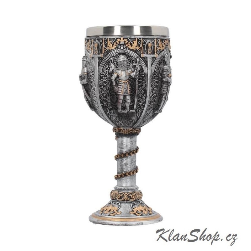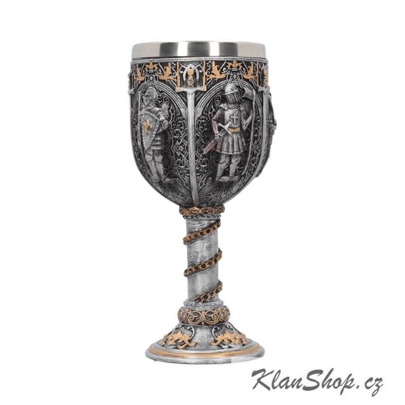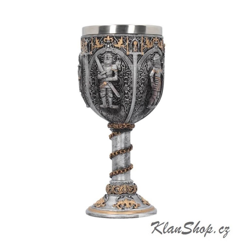 Dekorační pohár (kalich či číše) - rytíři ve zbrojích, středověké zdobení.