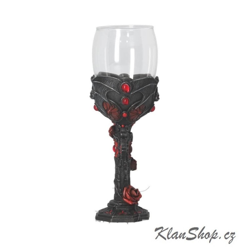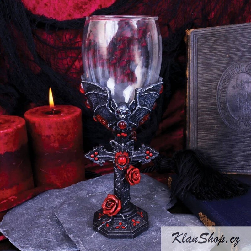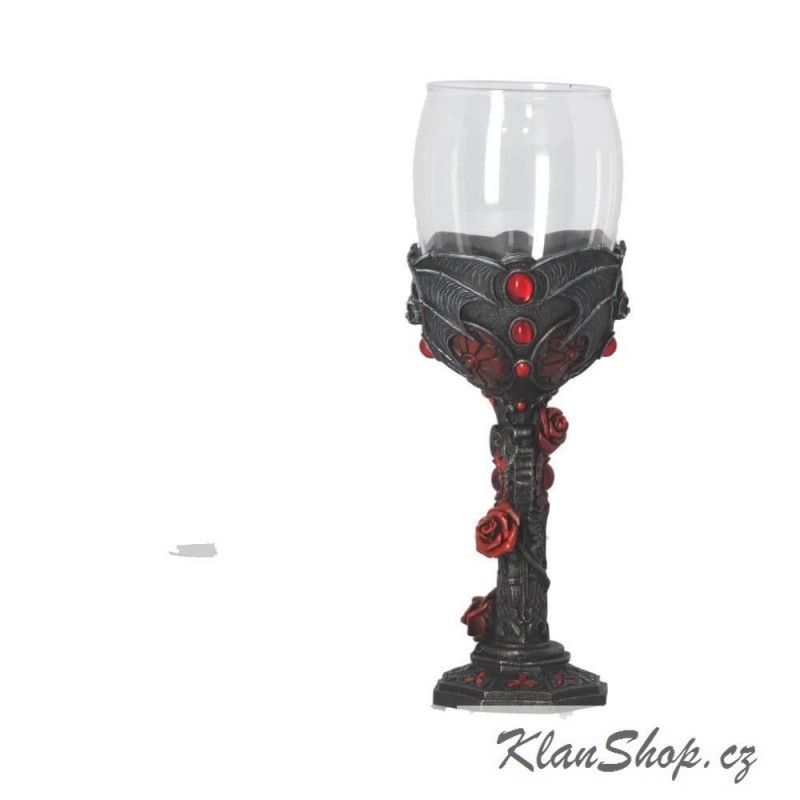 Dekorační pohár (kalich či číše) - kříž s netopýrem a červenými růžemi.