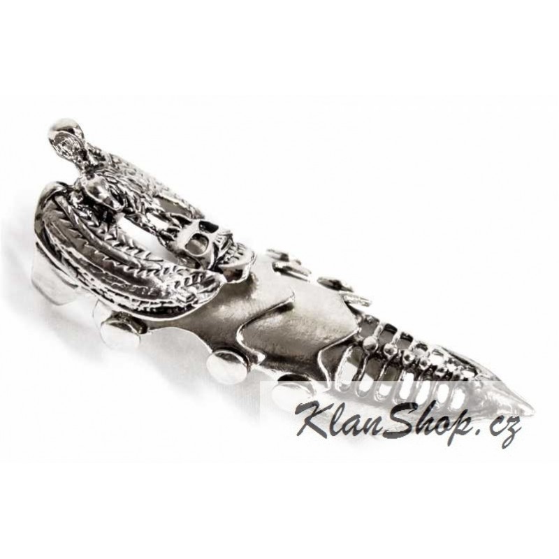 Kloubový prsten přes celý prst, lebka, smrtka s orlicí.