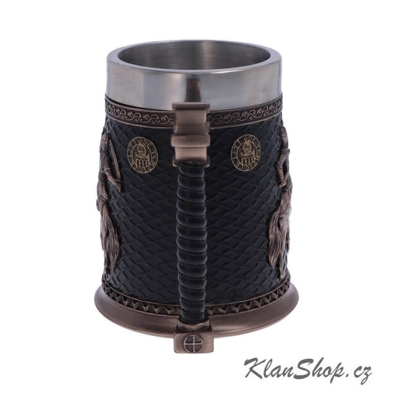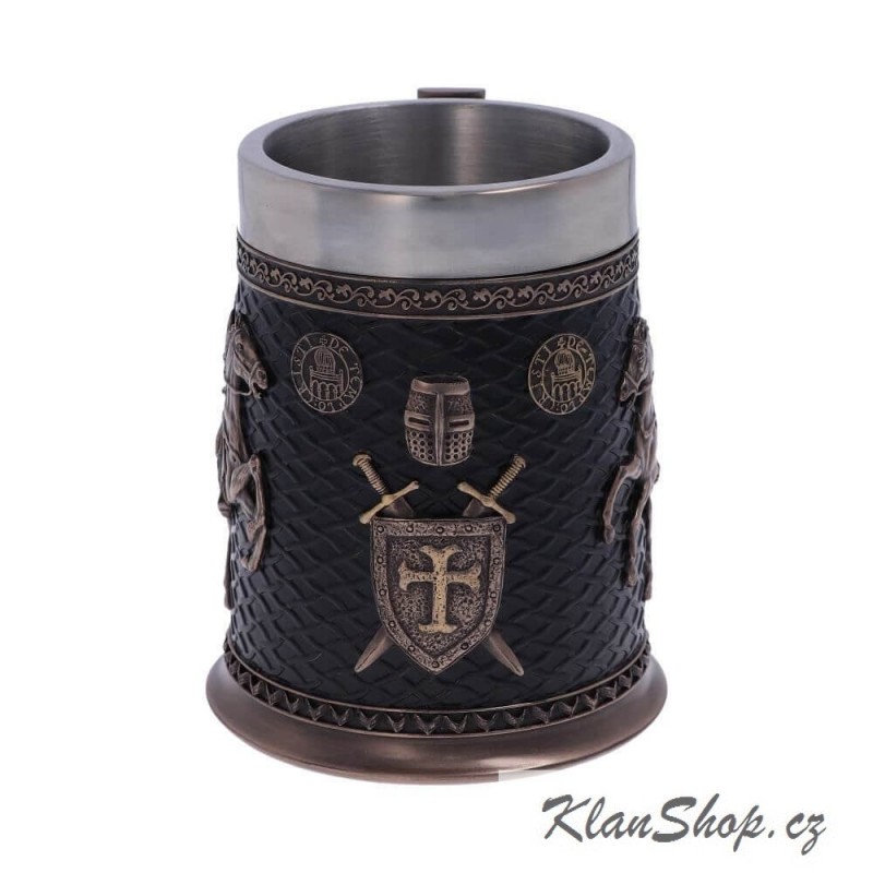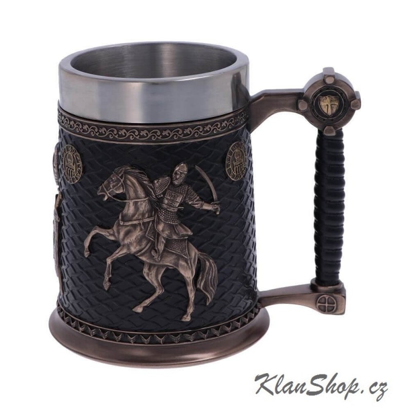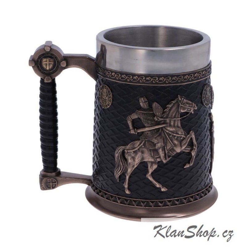 Dekorační korbel na pivo - rytíř ve zbroji jedoucí na koni, rytířské vybavení.