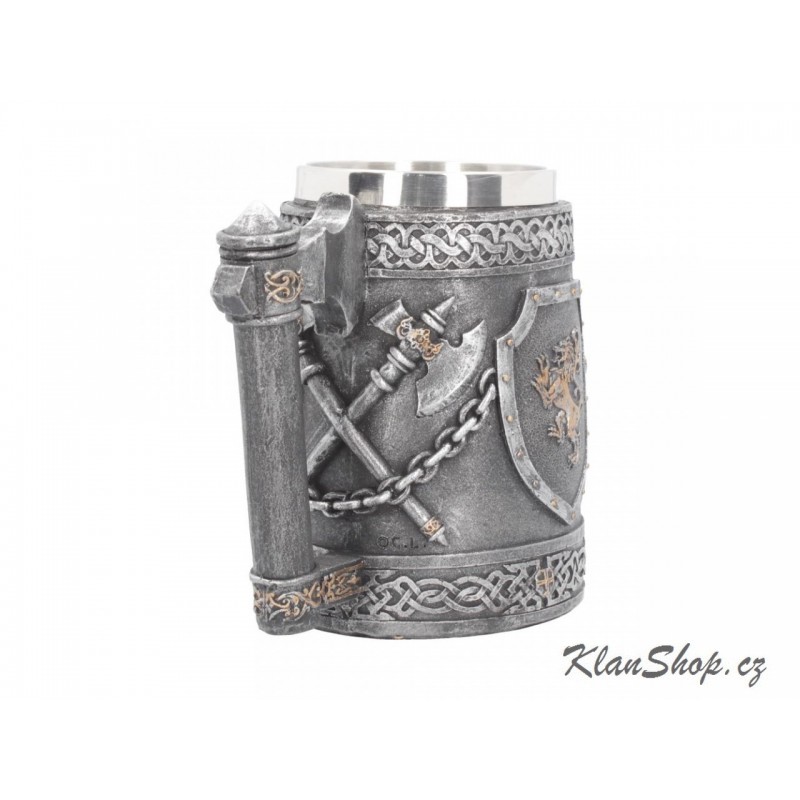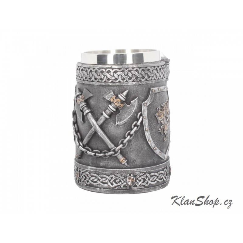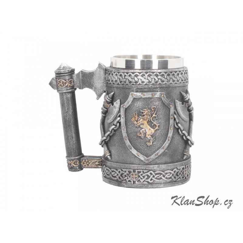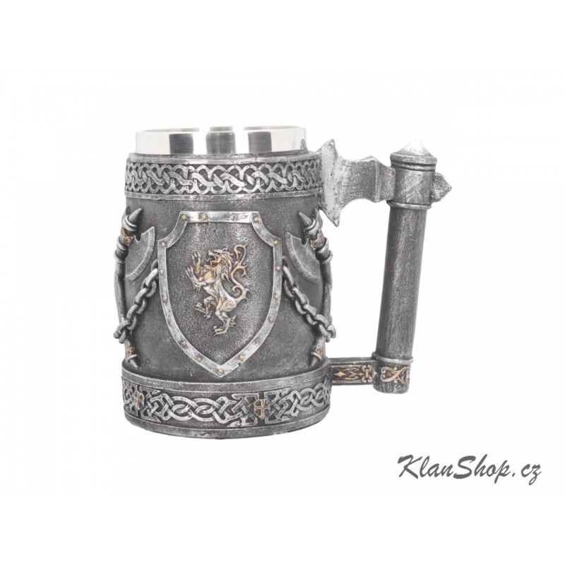 Dekorační korbel na pivo - středověké zdobení - erb se lvem, překřížené sekery.
