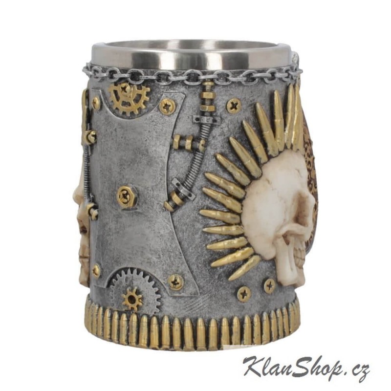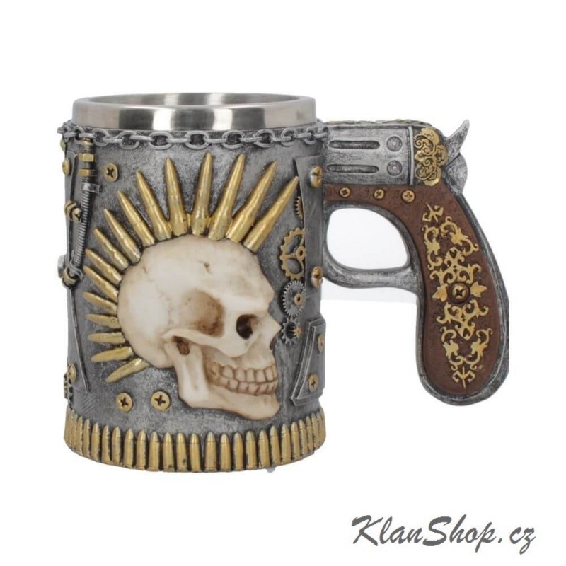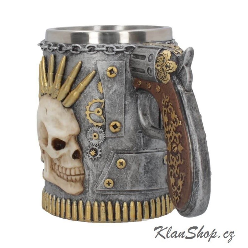 Dekorační korbel na pivo - ruská ruleta, steampunk lebka s nábojema.