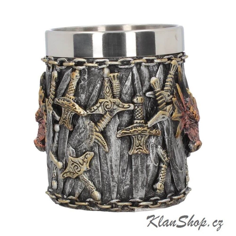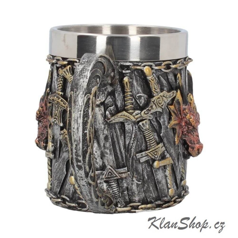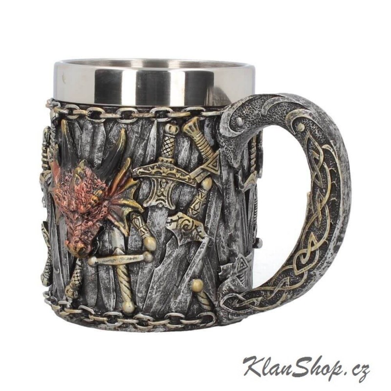 Dekorační korbel na pivo - dračí království, drak s rytířskými meči.