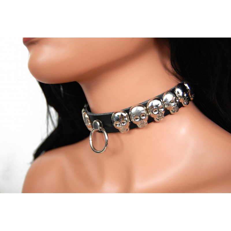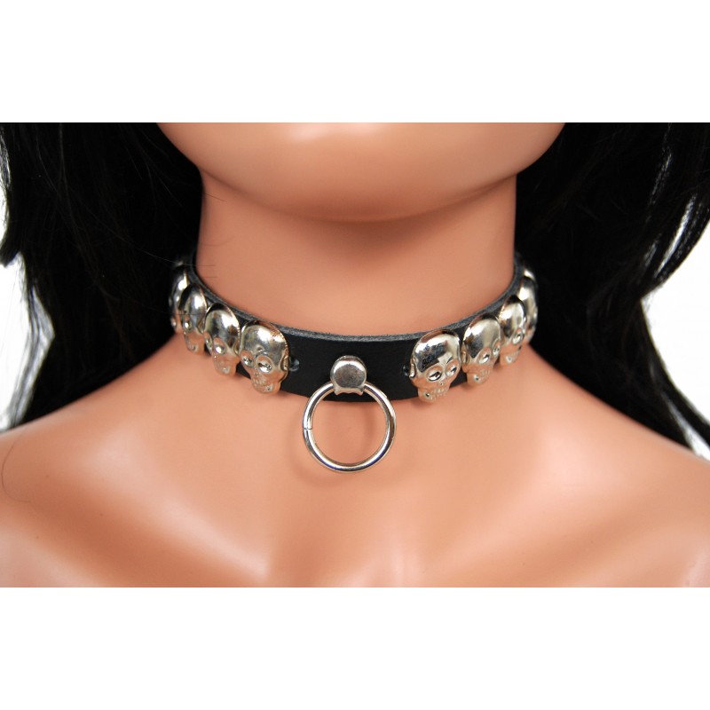 Kožený obojek na krk s lebkami a poutkem, 1 řada.