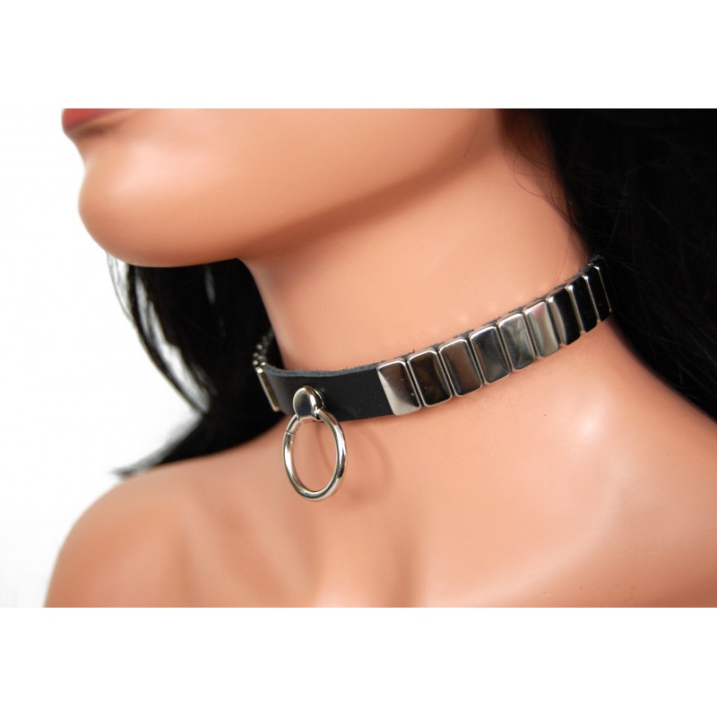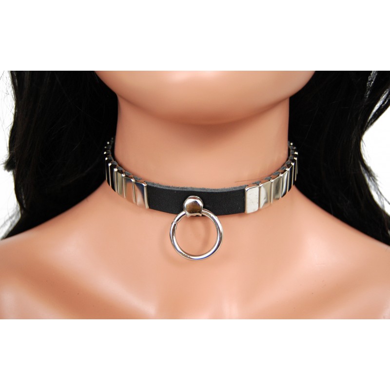 Kožený obojek na krk s ozdobnými plíšky a poutkem, 1 řada.