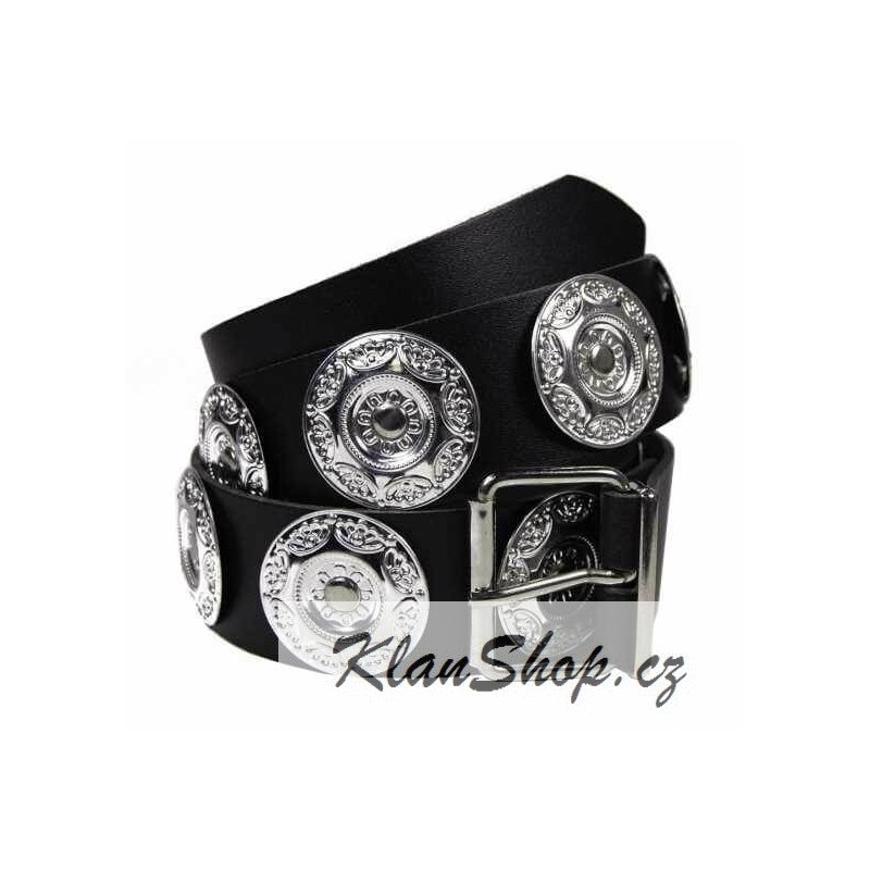 Kožený opasek s ozdobnými kroužky, western, kovbojské kroužky.
