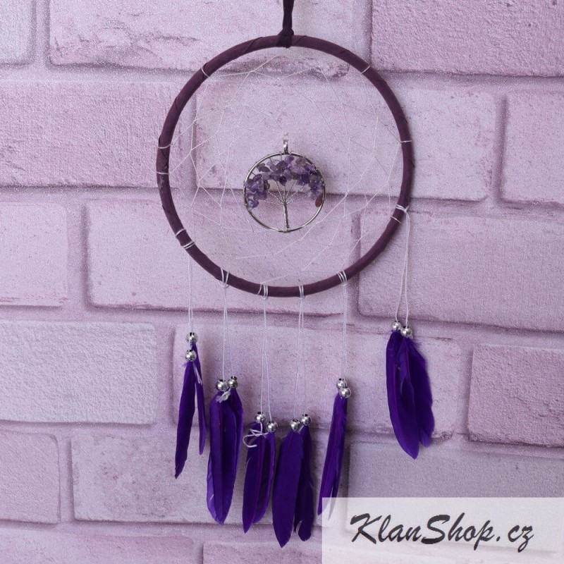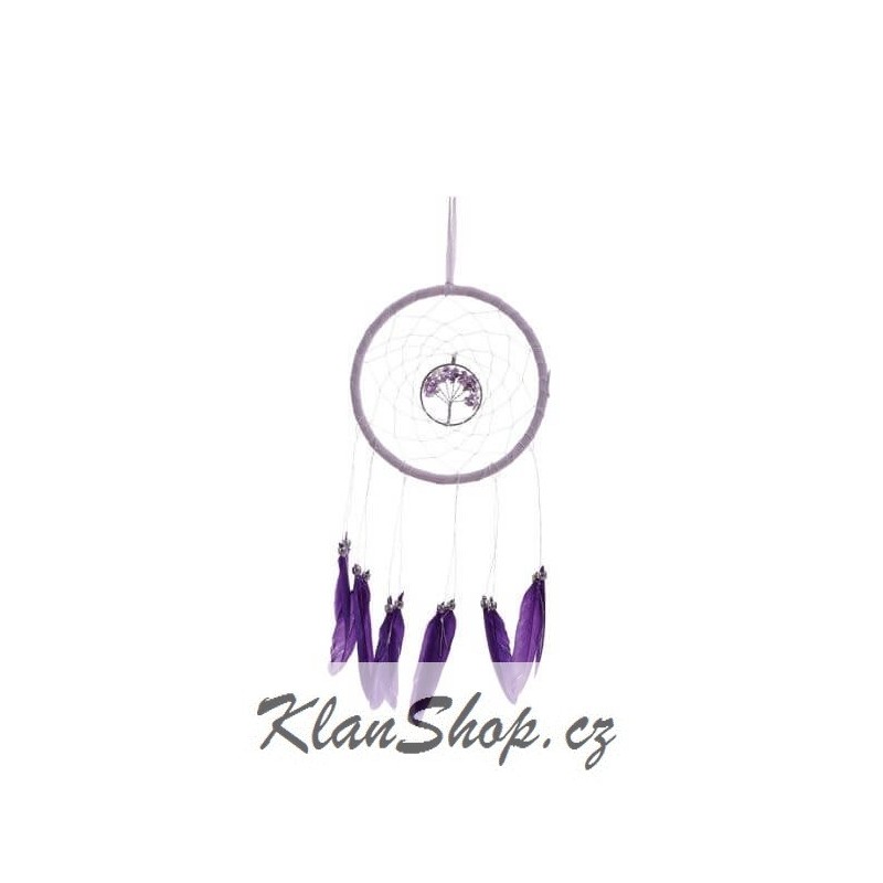 Dekorační lapač snů (lapač snů s obrázkem) - Strom života s fialovými pírky.