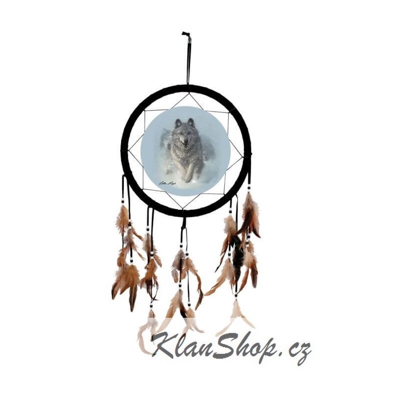 Dekorační lapač snů (lapač snů s obrázkem) - vlk ve sněhu s hnědými pírky.