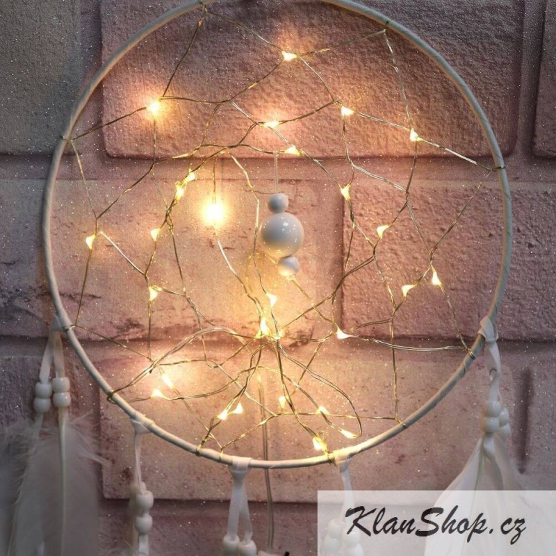 Dekorační lapač snů (lapač snů s obrázkem) - pavučina z LED světýlek, bílá peříčka.