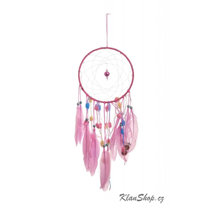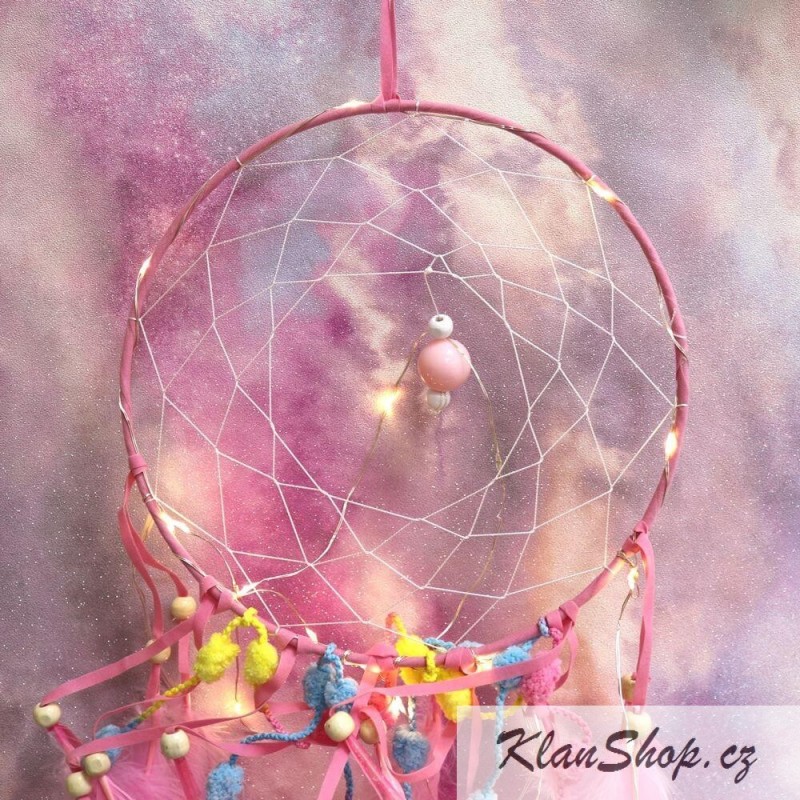 Dekorační lapač snů (lapač snů s obrázkem) - růžová peříčka, pavučina s LED světýlkama.