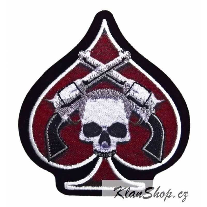 Motorkářská nášivka na kůži či textil - lebka s revolvery v pikovém esu.
