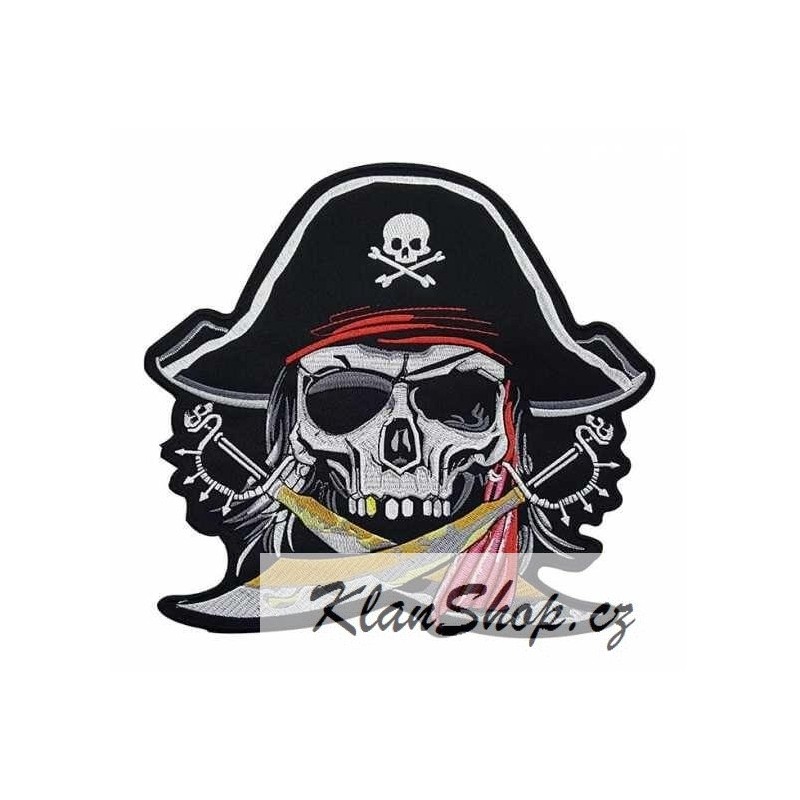 Nášivka na kůži či textil - lebka v pirátím klobouku se šavlemi.
