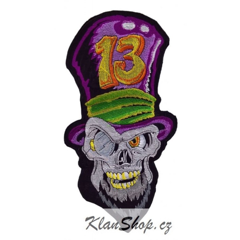 Motorkářská nášivka na kůži či textil - Lucky 13 lebka v cylindru.