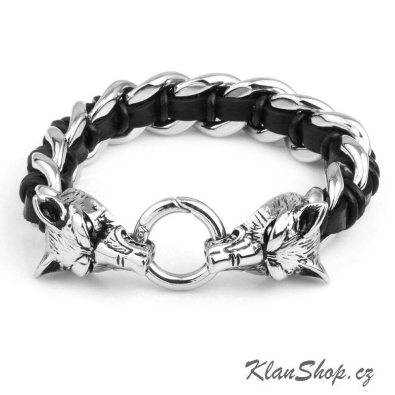 Náramek z chirurgické oceli tvořený z oček s vlky na koncích propletený černou koženou šňůrkou.