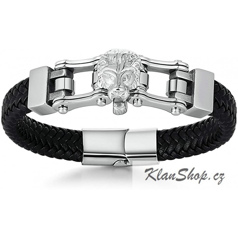 Náramek z černé kůže a chirurgické oceli se lví hlavou a motorovým řetězem.