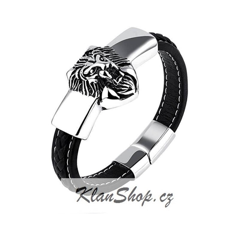 Náramek z černé kůže s bílým prošíváním a chirurgické oceli se lví hlavou.