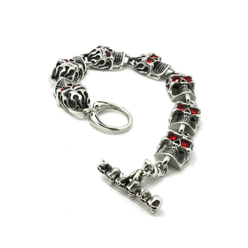 Náramek z chirurgické oceli, náramek s lebkami a plameny, červené zirkonové oči.